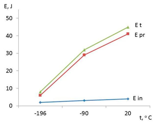 Another aspect of the testing of the V-notch weld metal specimens is the ratio of the crack initiation energy, Ein, and the crack propagation energy, Epr, which depends on the testing temperature. The total impact energy at room temperature was 45 J, while the crack growth energy was 41 J. With decrease in temperature to −90 °C, the total impact energy and crack growth energy were decreased by approximately 30%, whereas at −196 °C, they were just 15% of the room temperature value. With respect to the crack initiation energy, this was very low at all temperatures, from just 4 J at room temperature, to just 2 J at −196 °C. However, this is not of great importance for a weld metal, as already discussed, since crack-like defects in welded joints are inevitable, and, thus, the crack initiation energy should not be relied on.
