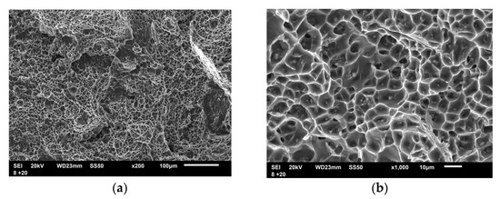 Fractographic testing of the specimens at different temperatures showed clearly distinguishable fracture mechanisms. Figure 10 shows the SEM fractographs of specimens tested after impact load at 20 °C. The entire fracture surface of this specimen was rough, covered with equiaxed dimples, which were quite uniform in size. At higher enlargement (Figure 7b), the particles of the secondary phases are observed on the bottom of dimples. This indicates the existence of a trans-granular fracture mechanism by void initiation, growth and coalescence. It appears that the voids are initiated mostly at constituent particles, while the coalescence occurs by impingement [35].