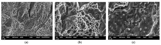 SEM fracture surface morphology of AA5083 alloy, under impact loading at −90 °C: (a) ×200 magnification; (b) ×1000 magnification, dimpled area; (c) ×1000 magnification, smooth area.