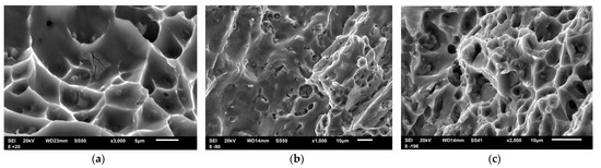 After the impact testing conducted at −90 °C, a dimpled fracture dominated on the fracture surface, with some smooth, wavy areas of intergranular fracture (Figure 11a). Nevertheless, when magnified, isolated dimples and numerous secondary phase particles can be seen on this intergranular fracture surface (Figure 11b). The coalescence of dimples occurred by shearing of the inter-void ligaments and, therefore, the resulting fracture surface was smooth (Figure 11c).