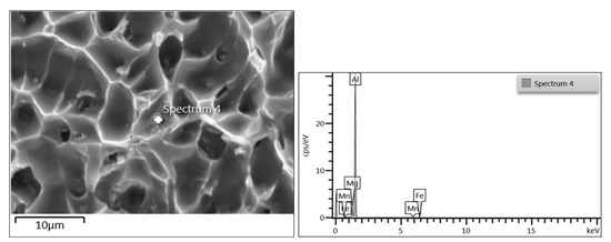 Voids were initiated at matrix/particle interfaces as a result of particle fracture. Fragmentations of the large second phase particles were observed at fractured surfaces at all temperatures (Figure 13). The EDS analysis revealed that these particles were present in the (Fe, Mn)Al6 phase (Figure 14). It was previously reported that these particles are very hard and brittle [37].