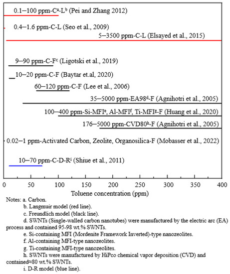 - Pei, J.; Zhang, J.S.S. Determination of adsorption isotherm and diffusion coefficient of toluene on activated carbon at low concentrations. Build. Environ. 2012, 48, 66–76. [Google Scholar] [CrossRef]