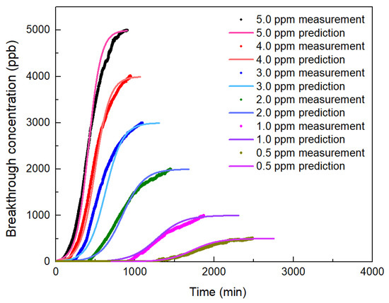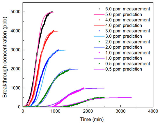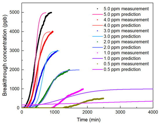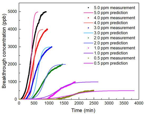 - Method 4: The transfer coefficient was calculated by the Wheeler–Jonas model at high concentrations (2.0–5.0 ppm). The Wood–Lodewyckx correlation, which took into account the properties of the adsorbate, was used to obtain the predicted values at low concentrations.
