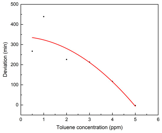 | Toluene Concentration (ppm) | Measured Service Life (min) | Modified Value (min) | Deviation (min) | Relative Deviation (%) |