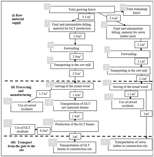 All calculations and modelling were completed by using the ToSIA (a tool for sustainability impact assessment) approach [46]. The topology of wood-based (GLT and ST) and concrete-based (SCC and PRC) value chains involve three stages: (i) raw material supply, (ii) processing and manufacturing, (iii) transport to the building site. Figure 1 presents the wood-based value chain that combines seventeen processes (Figure 1). The value chain starts with the total growing volume of the forest and ends with the transport of final construction materials (GLT and ST) to the building site.