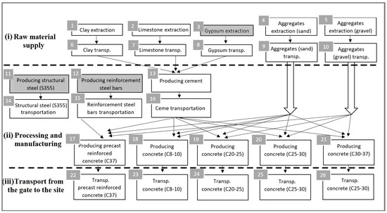 In this study, five concrete value chains were selected: four SCC and one PRC. C8–10, C20–25, C25–30 and C30–37 represent different strength classes of SCC. In our study, we used the recipe to produce 1 m3 of SCC as follows: C8–10—1 t sand, 1 t crushed stone, 0.2 t cement, 0.1 m3 water; C20–25—1 t sand, 1 t crushed stone, 0.26 t cement, 0.16 m3 water; C25–30—1 t sand, 1 t crushed stone, 0.3 t cement, 0.17 m3 water; C30–37—0.9 t sand, 1 t crushed stone, 0.35 t cement, 0.15 m3 water. The value chain starts with resource extraction and ends with the transport of the final construction materials to the building site (26 processes in total) (Figure 2). The topology of concrete-based chains involves three stages: (i) raw material supply, (ii) processing and manufacturing, (iii) transport to building site. The material flow through the production process was linked with the sustainability indicator values in each process. Material flows were calculated as per one cubic meter of final material produced.