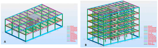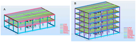 The reinforced concrete frame building structure and frame design for (A) two-floor and (B) five-floor public reinforced concrete frame building. K30 × 30–PRC column; Per_20–PRC stair landing (200 mm thick); Plokste25–PRC stair slab (average thickness 250 mm); R300 × 400–Rectangle cross-section PRC perimeter side beam; R500 × 400–L cross-section PRC main perimeter beam; R700 × 400–Upside-down T cross-section PRC main beam; ROS250 × 500–reinforced concrete foundation beam; Siena_25–reinforced concrete stairwell/elevator shaft wall (250 mm thick); TRON 88 × 5–round hollow bracing system pipe (88 mm diameter × 5 mm thick). Floor slab system consists of prefabricated 200 mm thick prestressed reinforced concrete hollow core panels + thermal/acoustic isolation + 60 mm thick fiber-reinforced concrete levelling layer + floor decoration.