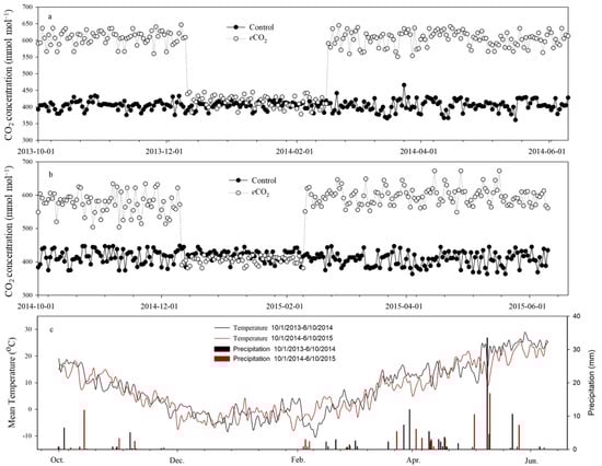 The CO2 concentration (a,b) and air temperature (c) in open-top chamber of wheat growing season on 1 October 2013–1 June 2014 and 1 October 2014–1 June 2015. Control—ambient atmospheric CO2 concentration; eCO2—elevated atmospheric CO2 concentration.