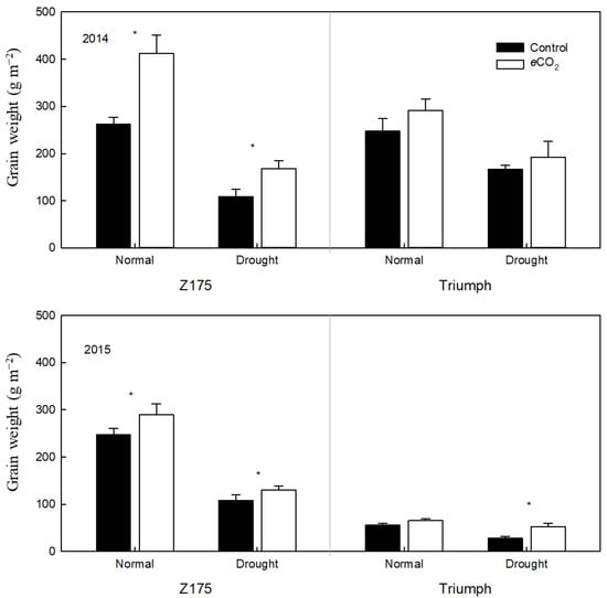 Effects of elevated [CO2] and drought on the grain weight of two wheat cultivars in 2014 and 2015. Values are means of 5 replicates. Control—ambient atmospheric CO2 concentration; eCO2—elevated atmospheric CO2 concentration. * indicates significance at p ≤ 0.05.