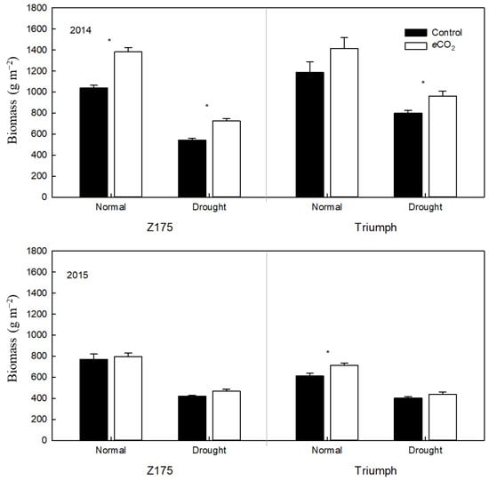 Effects of elevated [CO2] and drought on the aboveground biomass of two wheat cultivars in 2014 and 2015. Values are means of 5 replicates. Control—ambient atmospheric CO2 concentration; eCO2—elevated atmospheric CO2 concentration. * indicates significance at p ≤ 0.05.