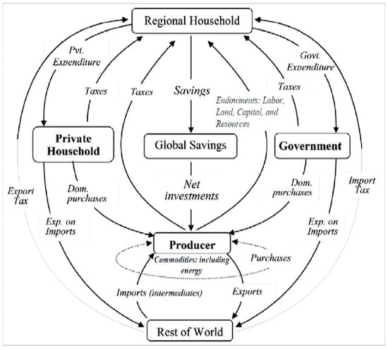 The standard multi-region applied computable general equilibrium model, GTAP, is used in this study. In the model, as shown in Figure 2, all the regional income is captured by one account, called a ‘regional household’. The sources of this income are taxes and by providing the factors of production (labour, capital, land, and natural resources) to firms. The regional household allocates this income, according to a Cobb–Douglas function, to the following three agents: private households, the government, and savings, with savings being subsequently used for investment. The optimizing behavioural equations for the three agents are described for each region. The behaviour of firms is governed by the profit maximization condition, according to a Cobb–Douglas production function. In this function, firms produce goods through combining production factors and intermediate inputs. The Cobb–Douglas function and a constant difference of elasticity function govern the demand behaviour of government and private households, respectively. For the Cobb–Douglas function, the shares of expenditure across goods are constant. For the constant difference of elasticity function, consumers’ demand for goods is affected by the change in their income; for example, consumers spend more on luxury goods when their income increases. In trade, the choice between domestic and international goods is governed by the Armington assumption []. More details on the GTAP model can be found in Hertel [].
