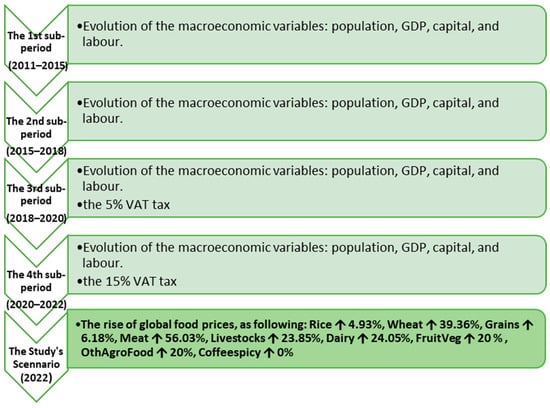 As the effects of the events modelled in this work took place in a later year than the reference year of the database, 2011, the database needed to be updated for the year of this study, 2022. To do that, several structural macroeconomic changes had to be taken into account. In addition, new fiscal policies that have been implemented between the reference year and the year of this study were incorporated. The macroeconomic variables reflect the growth of the economy, while the fiscal policies include the VAT taxes that were imposed by the Saudi government in 2018 and raised in 2020. Several sources were used to determine the changes in macroeconomic variables. The Saudi and global population growth, change in gross domestic product (GDP), and capital growth were obtained from the World Bank data []. For the ROW, the skilled and unskilled labour growth figures were obtained from the human capital index reports published by the World Economic Forum []. For Saudi Arabia, the skilled and unskilled labour growth figures were calculated using the following method: based on the GTAP classification, the skilled and unskilled labour were classified according to their education levels []; the Saudi labour types were classified using the labour force education status published by the Saudi General Authority of Statistics []. In this method, labourers with a bachelor’s degree or higher were classified as skilled labour, while the remainder were classified as unskilled. These changes and policies were incorporated in a recursive dynamic approach as is depicted in Figure 3. The 2011–2022 period was divided into four sub-periods according to the economic changes that took place. The first sub-period (2011–2015) was simulated by implementing growth in the following macroeconomic variables: population, GDP, capital, and labour. The solution of the previous simulation (sub-period) was used as an updated database for the next simulation, using the RunGTAP software’s [] “use updated database from last simulation” feature. The second sub-period (2015–2018) was simulated by modelling the macroeconomic variables. The third sub-period (2018–2020) was simulated by including the macroeconomic variables and the 5% VAT tax that Saudi Arabia imposed for most goods in 2018. The fourth sub-period (2020–2022) was then simulated, in which the macroeconomic variables and the new 15% VAT tax were implemented. Before simulating the effect of the recent unprecedented events on the ambitious Saudi sustainable goals, the updated database should be validated by a comparison between the resulting GDP and the actual latest GDP. The final step simulates the disruption to global food prices compared to the database reference year; the changes in the food prices were taken from different sources [,]. Figure 3 shows the steps followed for updating the database and the configured scenarios.