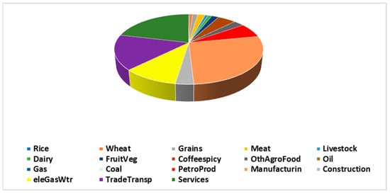 This study uses the GTAP 9 database, which represents a snapshot of the global economy in the year 2011 for 140 regions and 57 GTAP commodities []. As this study focuses on and aims to analyse the effect of recent unprecedented events on the ambitious Saudi sustainable goals, the GTAP regions were aggregated into two: Saudi Arabia and the Rest of World (ROW). In addition, the GTAP commodity sectors were aggregated into 18 sectors, according to the sectors most impacted by those events. The production factors were classified as follows: land, unskilled labour, skilled labour, capital, and natural resources. The GTAPAgg programme was used for the aggregation []. Table 1 presents a description of the regions, sectors, and production factors.
