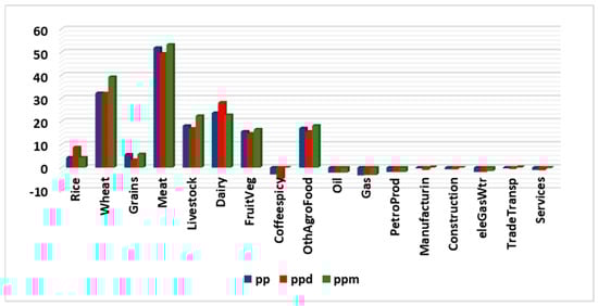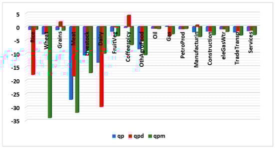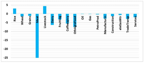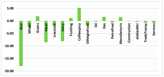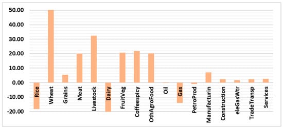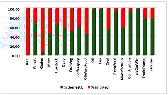 Table 2 shows the impacts of the scenario on different economic elements. The Saudi real GDP, which measures the value of all goods and services the economy produces after adjusting for inflation, declined by 0.39%. The nominal GDP, which does not account for inflation, decreased by 1.27%. This deterioration was caused by the reduction in household demand, as a result of the higher food prices. It is important to understand that food sectors represent approximately 15.3% of Saudi households’ budget, as shown in Figure 4. This deterioration in Saudi households’ demand for composite, domestic, and imported goods, and their prices, are shown in Figure 5 and Figure 6, respectively. A reduction in households’ demand for higher-priced food is clear. The magnitude of the reduction depends on two factors: the magnitude of the price increase, and the own-price demand elasticity. The own-price demand elasticity shows how sensitive consumers are to the price changes. The influence of the first factor can be seen in the “meat” and “dairy” sectors, while the effect of the second factor can be clearly seen in the “wheat” sector, where the reduction in consumer demand was not as high (sensitive), considering the soaring price. Observing the share of each sector in the country’s total output value and in consumption value is critical to the interpretation of the results. In addition, knowing the percentage of the domestic, exported, and imported products in these values is important to understand the significance of the results. For example, a large percentage increase/decrease of a sector with a small output share is less important than a small or medium percentage increase/decrease in a sector with a large share of the economy. The same applies to consumption, exports, and imports. Thus, the 18% reduction in the household demand for domestic rice, as shown in Figure 5, is not critical, as the domestic production of rice represents just 0.82% of the total rice production; the remaining 99.18% of household demand is for imported rice, as shown in Figure 7. Additionally, the large reduction in household demand for imported wheat (34%) affects the 28.77% imported share, while the 2.59% reduction in household domestic demand is for the 71.23% domestic share, as wheat is a major crop produced in Saudi Arabia. For the “Coffeespicy” sector, global prices were not changed in the scenario, as the 2011 prices, the year of database, were the highest this sector has reached. It is important to note that 62.07% and 37.93% of the “Coffeespicy” are domestic production and imported, respectively. Thus, the sector’s total household demand decreased very little (0.44%), even with a 4.22% increase in households’ domestic demand. This domestic rise was offset by the 6.88% decrease in households’ imported demand. For other commodities, the household demand fell for both domestic and imported goods; the reason behind this is obvious—as shown in Table 2, the Saudi household income has decreased by about 0.93%. As food commodities are necessity goods, their budget share increases because their prices rise. This led to a decrease in demand for the other commodities, even though their prices fell, as shown in Figure 5. The other commodities are less necessary based on their elasticity of income parameters.