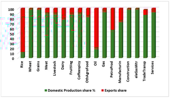 The share of domestic production and exports in each sector.