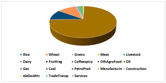 The impact of the scenario on the output of different sectors is shown in Figure 8. The figure illustrates that higher food prices would decrease the output of most sectors. This occurs despite the clear increase in the exports of most sectors and decline in the imports of most commodities, as depicted in Figure 9 and Figure 10, respectively. As mentioned previously, it is important to note the share of each sector’s output, exports, and imports to be able to understand and interpret the results without exaggerating large percentage changes or underestimating small percentage changes. For example, as shown in Figure 8, the 18.04% decline in rice output is less important than the 2.63% reduction in the wheat sector. That is because, as shown in Figure 7, the domestic production share of rice is only 0.82% while the domestically produced share of wheat is 71.23%. In addition, the 50% increase in wheat exports, as depicted in Figure 9, is not critical, as the share of wheat exports is just 0.44% of the Saudi wheat production, as shown in Figure 11. Moreover, as a result of the reduction in the household demand for meat (shown in Figure 5), the meat output decreased by approximately 8.5% (shown in Figure 8), even with the 19.89% increase in meat exports (shown in Figure 9). That is because exported meat represents only a 9.2% share of Saudi meat production, as depicted in Figure 11. In addition, the reduction in meat demand led to a 25.22% decrease in the meat imports, as shown in Figure 10. The impact on the dairy sector is similar to the meat sector regarding the reduction in output (8.08%, shown in Figure 8) and imports (23.55%, shown in Figure 10). The dairy exports, which represent 21.06% of Saudi dairy production, decreased by 6.27%, as shown in Figure 9. For the “coffeespicy” sector, the domestic production increased by about 5.19% (shown in Figure 8) as a result of the 21.92% increase in its exports, as shown in Figure 9. The oil and PetroProd (refined petroleum products) sectors are crucial sectors for the Saudi economy, as they represent 84% of the total Saudi exports value, as shown in Figure 12. Both sector outputs decreased, by 0.26% and 0.56%, respectively, because of the reduction in their exports by 0.2% and 0.94%, respectively. Moreover, manufacturing is a crucial sector in the Saudi economy as its exports represents 11.09% of the total exports value, which includes petrochemical, metals, and minerals products. The sector output increased by 1.52% as a result of a 5.66% rise in its exports.