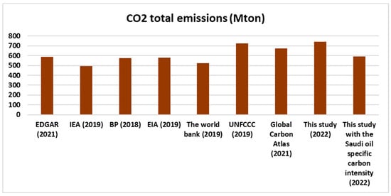 A global team from Stanford University recently published a comprehensive study about the carbon intensity of oil fields worldwide []. The study found that the carbon intensity of Saudi oil is one of the lowest in the world, approximately 55.34% less than the average global carbon intensity. According to the study, this is caused by multiple factors, including the continuous implementation of best practices in reservoir and greenhouse gas emissions management, minimization of flare, and the programme of detecting and repairing methane leaks. Recalculating the total CO2 emissions for Saudi Arabia based on the revised carbon intensity showed that Saudi carbon emissions were approximately 594.4 million metric tonnes per year (24.59% less than the first value). This implies that investing in implementing best practices in management of reservoirs will have a great impact in the context of mitigating greenhouse gas emissions. In addition, it is worthwhile for countries with large fossil fuel investments to specifically reassess the carbon intensity of their fossil fuels and not simply depend on the emission factors reported by international agencies. For example, Liu et al. [] assessed the emissions factor of coal in China and found that it is approximately 40% less than was reported by the Intergovernmental Panel on Climate Change (IPCC), which is the data used by most emissions inventories. Figure 13 shows the most recent published estimations of CO2 emissions for Saudi Arabia from different international agencies and from this study. These agencies are EDGAR [], IEA [], PB [], EIA [], the World Bank [], UNFCCC [], and Global Carbon Atlas []. There are different reasons behind the variations in these agencies’ estimations, for example the studies’ boundaries and what they include, the emission factors, whether land use is included, and the estimation year. This study gave a higher estimation because it covers a wider boundary (the whole economy). The UNFCCC is the agency, with a similar boundary but using a different methodology and an earlier year. It is crucial to note that economic development plays a major role in the increase in emissions [].