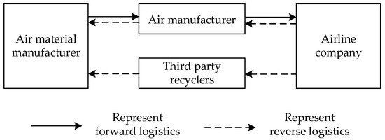 The research boom on the recovery management of retired aircraft began around 2010. Early scholars focused their research on the theoretical method of providing business guidance for the recovery of retired aircraft. For example, Zahedi et al. [5] adopted three key disassembly parameters, including time, difficulty, and material compatibility, to evaluate the efficiency of disassembly strategies according to technical, economic, and environmental standards. In recent years, research has focused on the evaluation of the recovery value of retired aircraft and the construction of the recovery system. For example, Zhao et al. [6] put forward an economic index to evaluate the economic performance of aircraft recovery and different strategic trade-offs, and evaluated the aircraft recovery strategy. Samira et al. [7] proposed an aircraft scrapping treatment method that comprehensively considered lean management, sustainable development, and global business environment, and built a comprehensive optimization framework to support strategy and management decisions through the fuzzy interactive method and genetic algorithm. Yakovlieva et al. [8] considered the characteristics of the disposal of retired aviation products, analyzed the existing methods and technologies, and introduced the complex utilization system of aviation equipment to solve the utilization and recovery of retired aircraft and its components. In the existing research, there is a lack of discussion on the game cooperation relationship and income analysis between the recycling channels and the recycling participants of retired aircraft. In this paper, we will introduce the concept of the closed-loop supply chain to further study the recycling of retired aircraft.