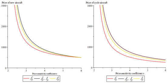 Figure 2, Figure 3 and Figure 4 show the four decision-making models. With the increase in the price sensitivity coefficient, the prices of aircraft parts, aircraft, and the total profits of the supply chain decrease. The increase in the price sensitivity coefficient means that airlines are more sensitive to the sales price of aircraft. In order to improve the sales volume of aircraft, aeronautical materials manufacturers and aircraft manufacturers will take price reduction measures. However, airlines tend to enjoy more favorable prices out of luck, which will lead to a decline in aircraft purchases, and thus affect the total profit of the supply chain. In conclusion, the increase in the price sensitivity coefficient is unfavorable to the overall profit of the supply chain.