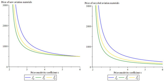 Propositions 1, 2, and 3 indicate that the sales price of aircraft under centralized decision making is the lowest, and the recovery price of retired aircraft is the highest among the four decision-making modes. This is because the supply chain decision makers take their own interests as the priority when making decentralized decisions. When aeronautical materials manufacturers are dominant, they can gain profits by increasing the sales price of aircraft parts, which will squeeze the profits of aircraft manufacturers. For their own consideration, aircraft manufacturers will correspondingly increase the sales price of aircraft, thus causing airlines to reduce the demand for aircraft. On the other hand, aeronautical materials manufacturers will benefit from lowering the recovery price in the recovery process. Similarly, when the aircraft manufacturer dominates, in order to maximize the revenue, the aircraft manufacturer obtains the aircraft parts at a lower price at the air material manufacturer, and in the recovery link, it obtains more profit margins through a lower recovery price.