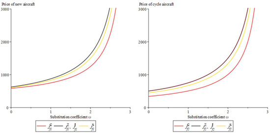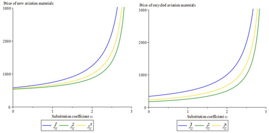 It can be seen in Figure 5, Figure 6 and Figure 7 that the market price sensitivity coefficient φ is greater than substitution coefficient ω under the condition of, whether centralized or decentralized decision making, the prices of aircraft parts, aircraft, and the total profits of the supply chain are increasing functions of substitution coefficients. This is because when the substitutability of circular aircraft and new aircraft becomes stronger and stronger, airlines have a higher acceptance of circular aircraft, and the participants in the supply chain also receive more profits from it. Therefore, the increase in the substitution coefficient is beneficial to the supply chain as a whole.
