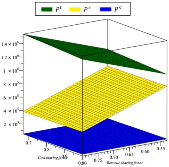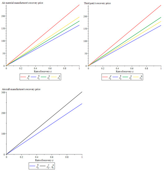 This part mainly discusses the changes in the pricing, recovery price and quantity, respective profits, and the total revenue of the supply chain of aeronautical materials manufacturers, aircraft manufacturers, and third-party recyclers under different power structures. In order to distinguish different models, the superscript c is used to indicate centralized decision making, the superscript t indicates that the manufacturer of air materials dominates, the superscript z indicates that the manufacturer of aircraft dominates, and the superscript s indicates that the third-party recycler dominates.