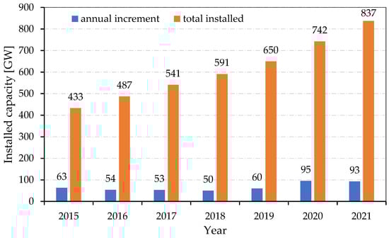 With the rapid growth of the economy and population, global energy consumption is expected to be doubled by 2050, and more severe energy challenges will arise in the future [1]. For the sustainable development of humanity and the protection of the ecological environment, China has already formulated the goal of carbon neutrality in 2060. Simultaneously, some of the world’s largest countries are also beginning to take the concept of carbon neutrality seriously and practice it. To solve the above-mentioned problems, it is urgent to develop renewable energy sources. Under this perspective, wind energy is regarded as the most widely used renewable energy in the world. The total number and annual growth of global wind turbine assemblers since 2015 are depicted in Figure 1 [2]. As can be observed, from 2015 to 2021, the global total installed capacity continued to grow steadily, with a cumulative global installed capacity of 837 GW by 2021. From 2015 to 2019, the global annual growth of wind turbines was about 50 GW. After 2019, the annual growth of wind turbines reached 90 GW. Thus, it is foreseeable that wind energy will play a more critical role in the future.