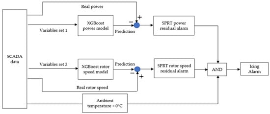 The regression task predicts state variables of the wind turbines, such as the active power on the grid side, the rotor speed, etc. The operating parameters closely related to the prediction variables are used as the model’s inputs, while the normal SCADA data are utilized to train the model. Then, the model’s predicted values are compared with the actual measured values, and the judging criteria are set according to the statistical knowledge or algorithm. If the residual error between the predicted and the actual measured values does not meet the judging criteria, the unit may be in the icing state. Guo et al. [20] analyzed the influence of the blade icing effect on the operation parameters of wind turbines. More specifically, the power, rotor speed, and ambient temperature were selected to detect blade icing. The normal behavior models of power and rotor speed were constructed by using the extreme gradient Boosting (XGBoost) method, and the sequential probability ratio test (SPRT) was introduced to analyze the model prediction residuals to identify the abnormal changes in the output power and rotor speed. Blade icing warnings were issued when the residual difference between the predicted and actual values of power and rotor speed were detected to be above the threshold at the same time and the ambient temperature was below zero. The authors found that the proposed blade icing detection method can warn wind turbines 5 h before the shutdown moment by icing. The principle of this technique is illustrated in Figure 3. Similarly, Fan et al. [21] established power and rotor speed models by using by adaptive boosting (AdaBoost) algorithm and introduced the exponentially weighted moving average method to analyze residuals.