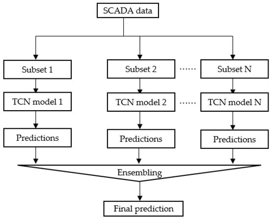In addition, Peng et al. [43] introduced a focal loss function to replace the traditional cross-entropy loss function. As a result, the impact of the data imbalance was weakened by reducing the weight of the simple sample loss during the training process since focusing on the training of samples with less data that are difficult to predict. Tong et al. [44] proposed a novel adaptive weighting strategy to eliminate the influence of data imbalance from the perspective of sample distribution information by using the support vector data description method. The authors combined it with the traditional fixed weighting strategy to develop an adaptive weighted kernel extreme learning machine (AWKELM) algorithm. Moreover, the superiority of the AWKELM algorithm was verified on two wind turbines, with a 23% improvement in the F1 score performance over WKELM. Ding et al. [45] combined the ideas of under-sampling and ensemble learning to under-sample normal data to obtain several subsets and assign icing data to each subset so that each subset was class balanced. Then, several classification models were obtained by training each subset using temporal convolutional networks (TCN). Finally, the prediction results of all models were averaged as the final prediction results of the samples. The model framework is displayed in Figure 5.