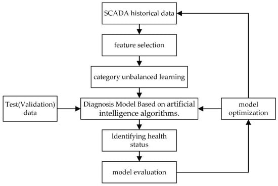 In summary, to solve the problem of data imbalance, data-based and algorithm-based methods are proposed, as presented in Table 2. The flow of the wind turbine blade icing classification model is roughly shown in Figure 6. First, the historical data recorded by the SCADA system was selected features and processed for data imbalance. Then, the model was modelled by using artificial intelligence algorithms. Finally, the model was evaluated and optimized by using the test set.