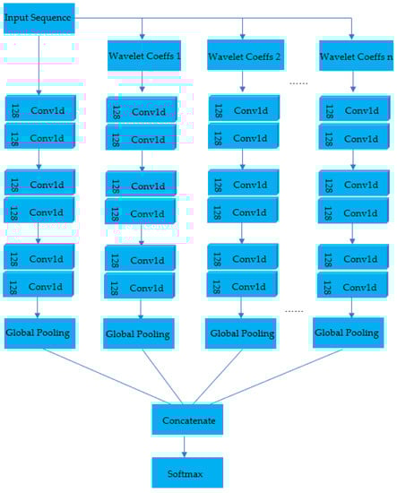 Wind turbine blade icing is considered a gradual process, and there is a correlation between before and after in the time dimension. Hence, the SCADA data are essentially time series data, which is mostly ignored by the previously-mentioned works. In addition, to solve the data imbalance problem, the SMOTE algorithm has been also used to generate icing samples that will destroy the characteristics of the SCADA data in the time dimension. Wang et al. [46] constructed time variation features based on the original data to solve this problem, while the DBN was used to construct the blade icing detection model. By considering the time dimensional information of the SCADA data, Li et al. [47] used a sliding window to intercept time series segments from the original data as the training samples. In this way, each training sample represents the state of the wind turbines over a period of time rather than a moment in time, making it thus easier for the algorithm to learn the hidden knowledge of the SCADA data. To better learn the information between the time sequence fragments, Yuan et al. [48] proposed a wavelet-based fully convolutional neural network (FCNN), namely Wavelet FCNN. The model framework is illustrated in Figure 7. The time-frequency domain information of SCADA data was learned by enforcing an orthogonal discrete wavelet transform. Based on this approach, the detection model was constructed by using the ensemble learning and CNN, and the global pooling layer was used instead of the fully connected layer to achieve the deep mining of SCADA time series samples. To further improve the robustness of this model, an anomaly monitoring algorithm combining the sliding windows and majority voting was designed during the simulation deployment stage. After the model predicted the real-time data, the multi-voting mechanism was used to determine whether the current data were abnormal by considering the wind turbine’s state over a while.