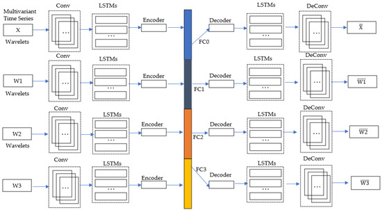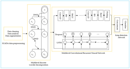 Most of the aforementioned data-driven icing detection approaches are supervised learning and have the disadvantage of being overly dependent on labels. However, the accurate labeling of large amounts of data can be very challenging. Under this direction, the semi-supervised learning approach is a learning framework that addresses this problem. It allows predictive models to be built by using a small amount of labeled data and a large amount of unlabeled data [53,54]. In this regard, Yi et al. [55] proposed a graph-based semi-supervised learning system. It first used mutual information to extract features from data to eliminate redundant variables. Then, the graph data are constructed from processed data and a small amount of labeled data is used to represent the relationship between the samples. Finally, through the iterative operation of the label propagation algorithm of the graph, the initial label information is propagated to the data for classification. Autoencoder (AE) is also an effective unsupervised learning method to learn the potential representations of the input data [56]. Autoencoder have been also introduced for icing detection in wind turbines. Yuan et al. [57] proposed a wavelet enhanced autoencoder model (Wavelet AE), whose specific architecture is depicted in Figure 9. The input SCADA data were first decomposed into multi-level wavelet detail coefficients. Then, at each scale layer, the SCADA data or wavelet detail coefficients were passed through the CNN encoder and the LSTM encoder, and the hidden states of the LSTM encoder were concatenated to form a global code. In the decoding stage, the fully concatenated layer first mapped the global code to the initial hidden state at each scale. Then the LSTM decoder and CNN decoder reconstructed the SCADA data and wavelet detail coefficients as the way to learn the low-dimensional representation of SCADA data, and then the encoder part was used as a feature extractor. A SoftMax layer was added as a classifier to supervise the model’s training using labels. Moreover, the method’s effectiveness was verified in real datasets, and the model accuracy and precision metrics reached more than 80%. Additionally, Liu et al. [28] applied deep auto-encoders to learn multilevel fault features from SCADA data adaptively and used the idea of ensemble learning to construct an integrated icing detection model by adding classifiers after each hidden layer of the network. This method has been also tested on another wind turbine, on which the model’s accuracy was as high as 96%, and the MCC coefficient was 0.783, which was better than RF, SVM, shallow neural networks, and DNN.