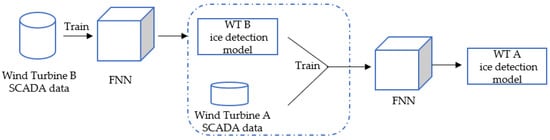 In some cases, obtaining a large amount of training data for the target domain is difficult and expensive. Therefore, it is of great significance to learn from the relevant source domain to transfer knowledge to the target domain and build a high-performance model for the target domain, which is the motivation for transfer learning [60]. For wind turbines, different geographical locations and environments lead to specific differences in the operation data of wind turbines. The model based on a single wind turbine has the problem of insufficient generalization ability when it is directly applied to other wind turbines. Meanwhile, the retraining model for the target wind turbine has the problem of inadequate data and label quality. Therefore, Zhang et al. [61] proposed a CNN detection framework based on the inductive transfer learning (ITL) method. As shown in Figure 11, the author used many source domain data to train FNN to construct a high-performance icing detection model for wind turbine B. Based on the icing detection model of wind turbine B, the author used a small amount of SCADA data (target domain data) of wind turbine A to quickly update the model to construct the icing detection model of wind turbine A. The authors also compared it with the direct application of FNN. Interestingly, the inductive transfer learning based FNN can detect about 79% of the ice data, which is 14% more accurate than the direct application of FNN.