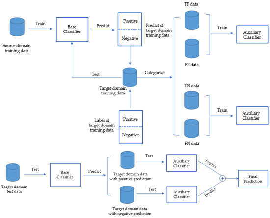 Yun et al. [62] proposed an adaptive inductive transfer learning (adaptive ITL) method for detecting wind turbines. The underlying principle is displayed in Figure 12. First, the source domain data was used to train the base classifier and to predict the target domain data. Then, based on the prediction results, the predicted icing and non-icing data were used to train the precision auxiliary classifier and recall auxiliary classifier, respectively. The basic classifier first classified each test sample in the testing phase. Then, the samples were fed into the auxiliary classifier based on the prediction results, and the output of the auxiliary classifier was used as the final prediction result. The author used RF, AdaBoost, FNN, and other classifiers, to verify that the classifier’s performance was improved with adaptive ITL.
