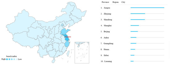 Jiangsu is located in the eastern coastal areas of China, bordering with Shanghai, Zhejiang, Anhui, and Shandong. The province is densely populated, relatively economically developed with many lakes and rich tourism resources, and has the largest number of 5A scenic spots in China. This study takes “Jiangsu tourism” as the keyword and uses the “crowd portrait” function of Baidu index platform to obtain the strong and weak demand for Jiangsu tourism information of the scenic spot source market. As can be seen from Figure 1, the source market of 5A scenic spots in Jiangsu is relatively concentrated, and most tourists come from Jiangsu, Shanghai, Zhejiang, Guangdong, and Shandong. However, affected by the epidemic, tourists in the province have the strongest demand for tourism information in Jiangsu, which ranks first.