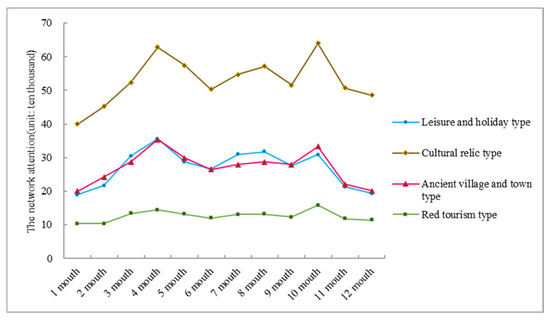 Thirdly, from the perspective of the monthly and weekly changes in tourists’ preferences, the monthly average concern of cultural heritage scenic spots such as Fuzimiao, Zhongshanling, Suzhou Garden, and Lingshan is the highest, and the overall fluctuation is the largest. The concern values of leisure resort scenic spots and ancient village and town scenic spots are roughly similar and slightly lower than those of cultural heritage scenic spots, while that of red tourism scenic spots is relatively low and the overall fluctuation is relatively smooth. Overall, the average monthly attention of tourists to the four types of scenic spots shows a trend of “three times up and three times down”, with a large increase from January to April, reaching a peak value in April, then a decline in attention from April to June, a slight rebound from June to August, a trough in September, another peak in October, and a gradual decline from November to December (Figure 3). In addition, the weekly online attention of the four types of scenic spots is proportional to the monthly period, which fluctuates little, on the whole. Tourists pay the most attention to the scenic spots that belonged to the cultural relics type, peaking on Sunday, while paying the least attention to the scenic spots belonged to the red tourism types.