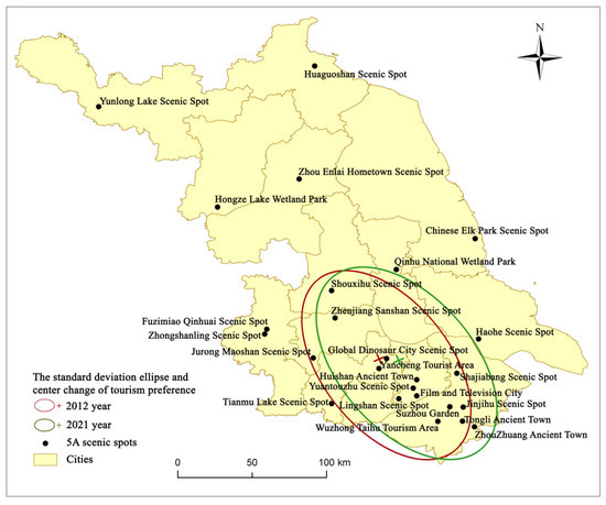 The method of the standard deviation ellipse, first proposed by Welty, could measure the direction and distribution of a set of data. This paper used the standard deviation ellipse to explore the spatial distribution pattern of tourist preference and the evolution characteristics of 5A scenic spots in eastern coastal provinces from 2012 to 2021. Its parameters mainly include the barycentric coordinates, area, and the standard deviation along major axis and short axis, etc. The barycentric coordinates represent the relative position of the spatial distribution of tourists’ preferences, the area is the extensibility of its spatial distribution, the length of the major axis and minor axis represents the degree of dispersion in the primary and secondary trend direction, and the azimuth reflects the main trend direction of its distribution [28].