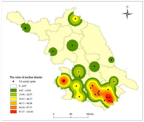 where f(x) is the estimated value of kernel density, h is the search radius (h > 0), n is the total number of 5A scenic spots in Jiangsu, k(x) is the kernel function, and (x − Xi) represents the distance from the estimated point x to Xi. Among them, the larger the value of f(x), the more intensive the network attention of the tourist attractions and the greater the influence on the surrounding neighborhoods.