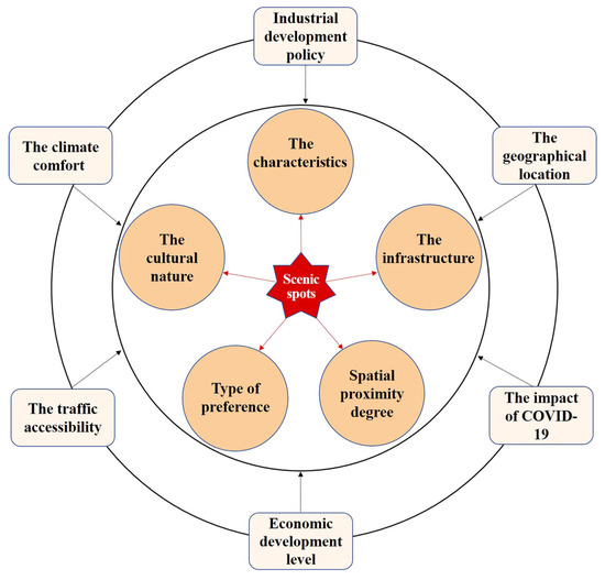 Through the systematic analysis of tourists’ preference, based on limited attention theory and tourist behavior theory analysis, this study concludes that the choice of tourist preference types and their spatial changes of 5A scenic spots in Jiangsu are the result of a combination of internal and external factors. In Figure 5, the inner circle represents the attractiveness of scenic spots affecting tourists’ preferences, forming an internal driving mechanism, and the outer circle represents the influence of external environment affecting tourists’ preferences, forming an external driving mechanism (Figure 6).