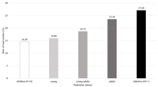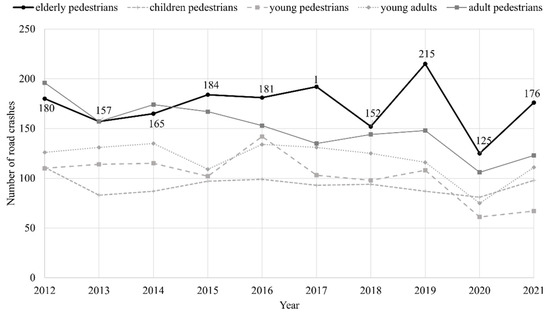 Figure 1 showing a comparison of the trend for different age groups of pedestrians. Specifically, five age groups were considered: children, from 0 to 14 years; young pedestrians, from 15 to 24 years; young adults, from 25 to 44 years; adults, from 45 to 64 years; and elderly pedestrians, from 65 years. As shown in