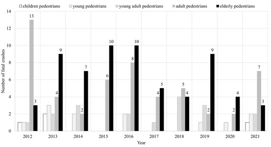 Figure 3, only fatal accidents are considered. Even with this accident severity, it can be observed that the two most critical groups of pedestrians are the elderly and adults. However, while adults saw a jump in the number of fatal accidents to 13 only in 2012, a pattern can be seen among the elderly, with very high accident numbers in 2013, 2015, 2016, and 2019.