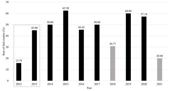 Figure 4 shows a sharp increase in the involvement of elderlies in fatal accidents: from 2012 to 2013, there was a jump from 15.79% to 45%, with a generally constant trend in the following years. This trend above 45% was maintained for the whole analyzed period, though a slight decrease is observed in 2016, while a drop in fatal accidents involving the elderly occurred in 2018 and 2021, with 30.77% and 20% fatal accident rates, respectively.
