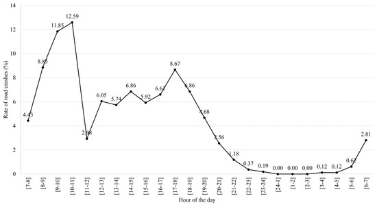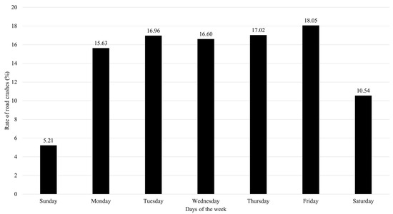 Figure 5 shows the trend of pedestrian accidents throughout the day, highlighting two peaks: one in the morning from 8.00 to 11.00 a.m. and one in the late afternoon from 4.00 to 7.00 p.m. This appears to be consistent with the times when elderly people are more likely to be out and about, typically in the early morning, when they normally fulfill their daily obligations (e.g., going to the market, visiting the doctor, etc.) and in the evening, when they usually prefer to go out for pleasant activities, such as a relaxing walk or a visit to see a friend. In addition, it can be noted that the entire period from 7.00 a.m. to 8.00 p.m. seems to be critical for elderly pedestrians, while the hours from 8.00 p.m. to 7.00 a.m. show a decreasing trend. Considering the days of the week, it can be observed (
