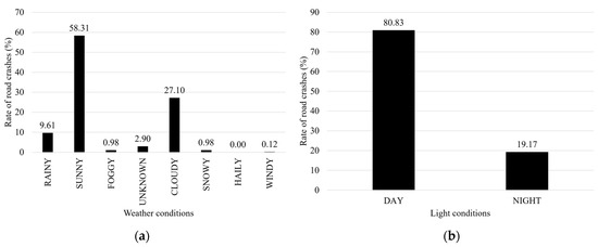 Figure 8b) status. Interestingly, most accidents occur during daylight hours, which is consistent with the results of the previous sections and is confirmed by the need of elderlies to fulfill their daily activities during the day. Additionally, many elderly people are aware of their physical restraints and do not feel secure when being out during night hours. With regard to the weather, the majority of collisions occur when it is sunny (58.31% of all traffic accidents). After that, cloudy and rainy days are also critical for the elderly, with rates of 27.10% and 9.61%, respectively.