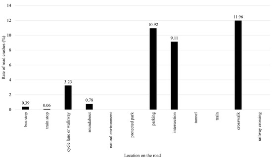 Figure 10) shows that the majority occur at isolated crosswalks (11.96% of cases), parking lots (10.92%), and intersections (9.11%), indicating that the highest risk for the elderly is when there is a close interaction with the traffic flow and where they assume that pedestrians have the right of way. Finally, the condition of the road surface is also considered. In line with the previous findings that December and January are the most critical months for elderly pedestrians, and that sunny and cloudy weather most often leads to traffic accidents,