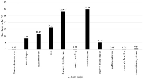 One advantage of the database used as a starting point for this research is that it contains information about the causes that led to the accident, according to police reports. In this database, 11 categories are considered, namely, disconnections on the road, inappropriate speed, pedestrian error, disregard for the right-of-way rules, incorrect overtaking, unpredictable movements of the vehicle, wrong direction of travel, problems with the load, problems with the vehicle, inappropriate safety distance, and other unspecified causes. It can be seen from