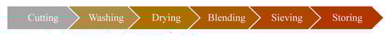 The barley waste sample was prepared following the American Society Testing and Material (ASTM E1757-01) method. The waste sample was collected from a local firm in the UK. After collection, it was cleaned properly with water to remove the dirt and kept under sunlight for one week. Then, the samples were placed inside the oven at 100 °C for 6 h to eliminate the moisture properly. The samples were then ground into small particles. Finally, the ground barley was sieved using a regular sieve No. 60 to obtain particles smaller than 0.25 mm and sealed in a sealed bag to avoid air interaction. The sample processing diagram used in this research is shown in Figure 1.