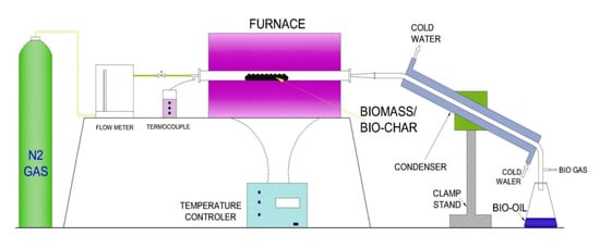 The pyrolysis process of the barley waste was conducted by a lab-scale, fixed-bed pyrolysis setup (Figure 3). The experiments were performed using the stainless steel reactor (inside dia-27 mm, and length-500 mm) inserted horizontally inside the tube furnace (Gero 300–3000, Carbolite Electrical Furnaces, Hope Valley, UK). For each experiment, 25 g of sample material were fed into the reactor. The biomass with the reactor was placed inside the furnace to run the pyrolysis process. The pyrolysis procedure was carried out at 400, 500, and 600 °C temperatures with a steady heating rate of 25 °C/min under 0.5 L/min of N2 (99.99% pure) flow rate. The procedure was continued after achieving the target temperature until no more bio-oil was generated. Cold water was passed through the condenser to support the condensable gases become condensed. Biochar was collected from the reactor, whereas the bio-oil was taken from the Erlenmeyer flask. The percentage of syngas was computed from the mass balance of the biomass.