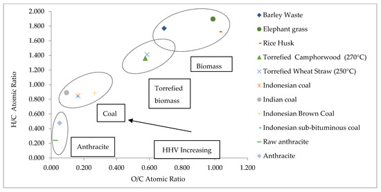 Based on the data in Table 2, the Van Krevelen diagram was plotted according to the atomic ratio of H/C vs. the atomic ratio of O/C which is represented in Figure 4. The major four zones of anthracite, coal, torrefied biomass, and biomass are all presented in the figure. It is the assessment to check the group of the sample. According to the H/C and O/C results, this waste sample is perfectly fitted in the biomass zone. Barley waste is thus a potential source of biomass for the generation of biofuels [4,43].
