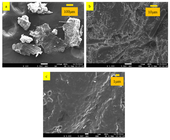 For morphology analysis, SEM is one of the most reliable techniques as it can provide complete, extensive, well-contrasted, and high-resolution images [54]. SEM micrographs of this biomass are shown in Figure 5a–c at 100, 1000, and 5000 magnification levels, respectively. From the images, the barley waste exhibits numerous fibers stuck together with no pores. The surface of the sample is uneven for the durable bond between the pectin and non-cellulosic constituents [55]. The fibrous surface of the sample can be promising for biofuel creation, as this escalates the compressive strength and the impact resistance [56].